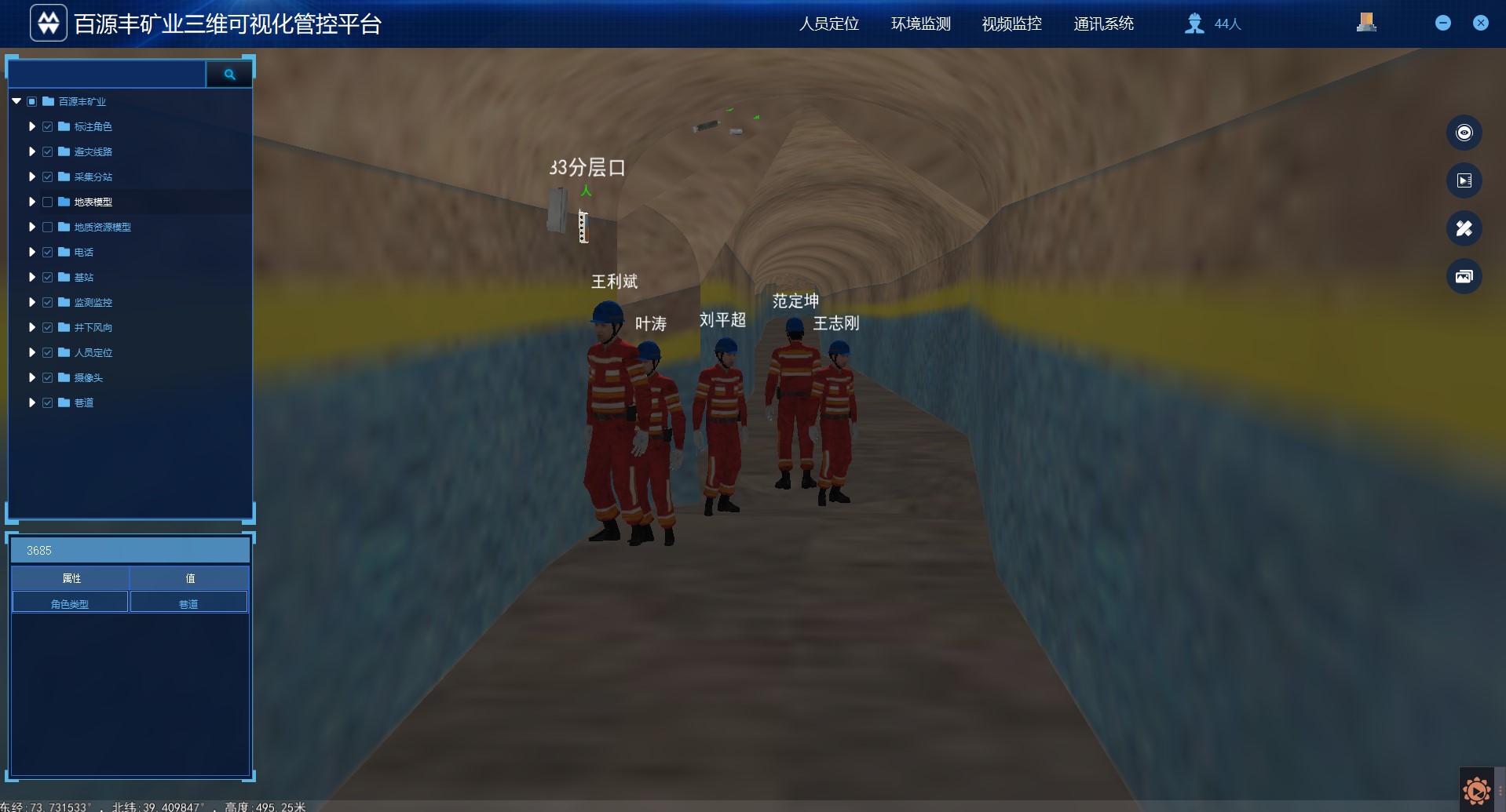 三維管控軟件平臺以礦山資源與開采環境三維可視化和虛擬環境為平臺,利用三維GIS、虛擬現實等技術手段,將礦山地上地下場景、井巷工程進行真實三維數字化建模,實現對礦山生產環境、生產狀況、安全監測、人員和設備狀態的實時高仿真顯示。在真三維環境中集成礦山開發與運行的相關信息,解決礦山信息化建設過程中基礎信息不足、信息孤島和可視化等方面的問題。
