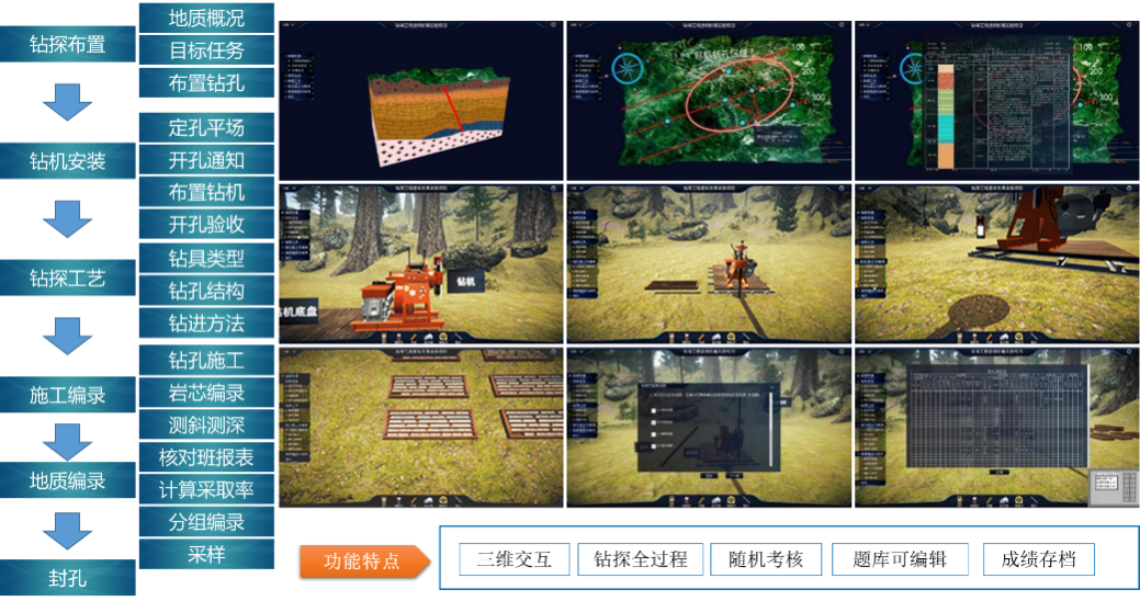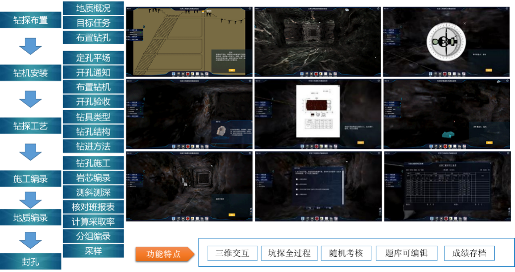 目前桂林理工大學地球科學學院礦產勘查專業使用的教材和教學手段僅靠傳統三視圖和文字說明,很難讓學生完全理解和掌握當今礦產勘查種類繁多的新技術、新系統。虛擬仿真教學通過多媒體技術可以高效地向學生展示生產現場和實習內容,使用網絡技術又便于學生根據自己的喜好選擇自己感興趣的內容,設定適合自己學習進度,從而幫助學生更好地了解現場情況,從而提高現場實踐的學習效果和效率。